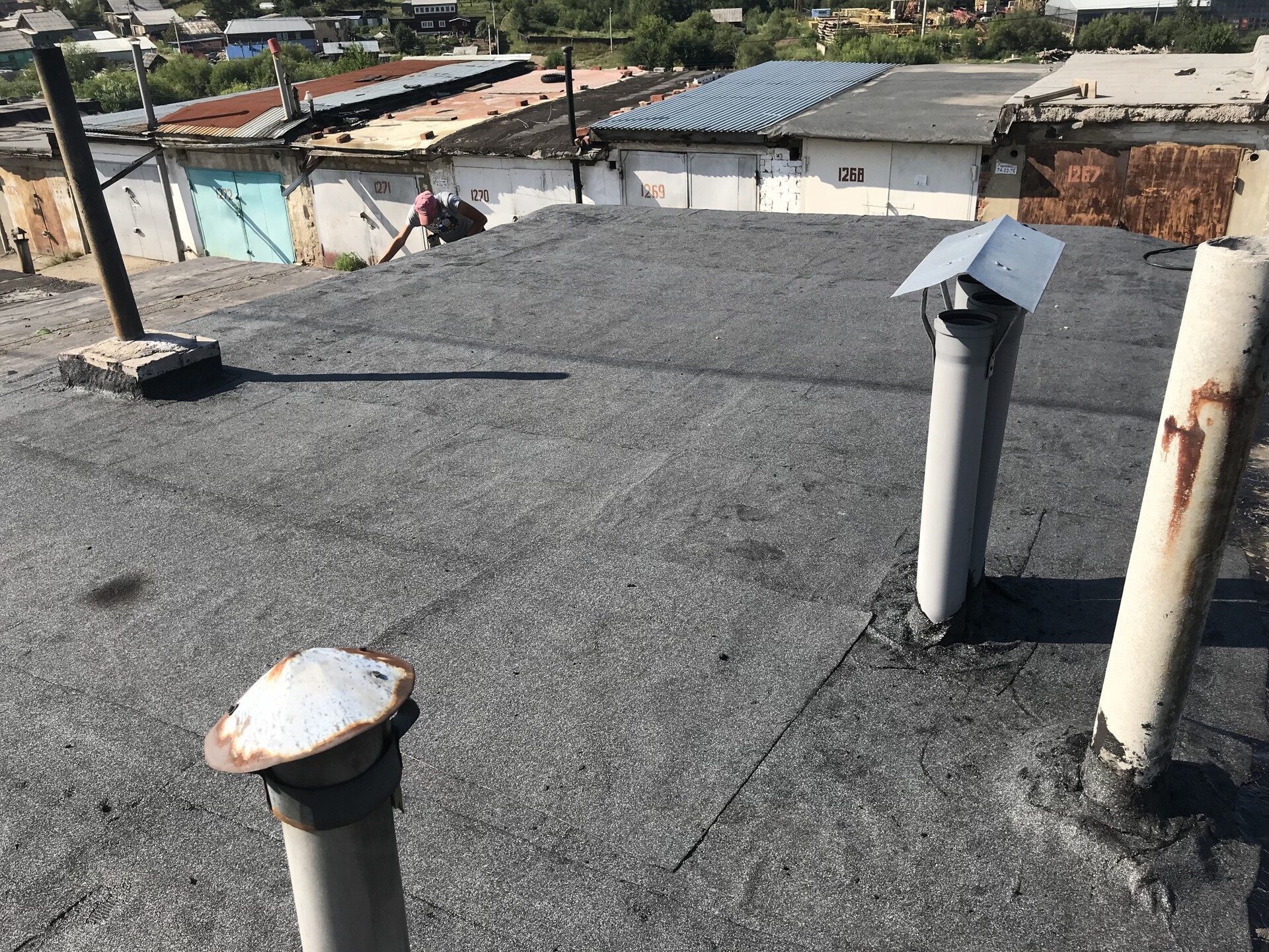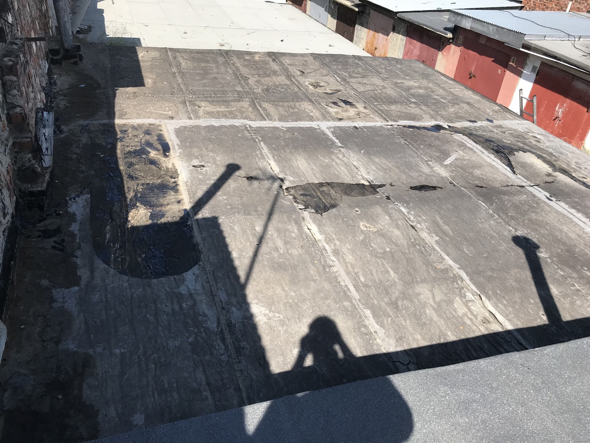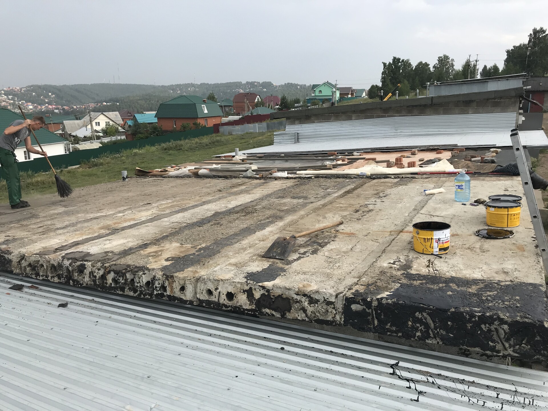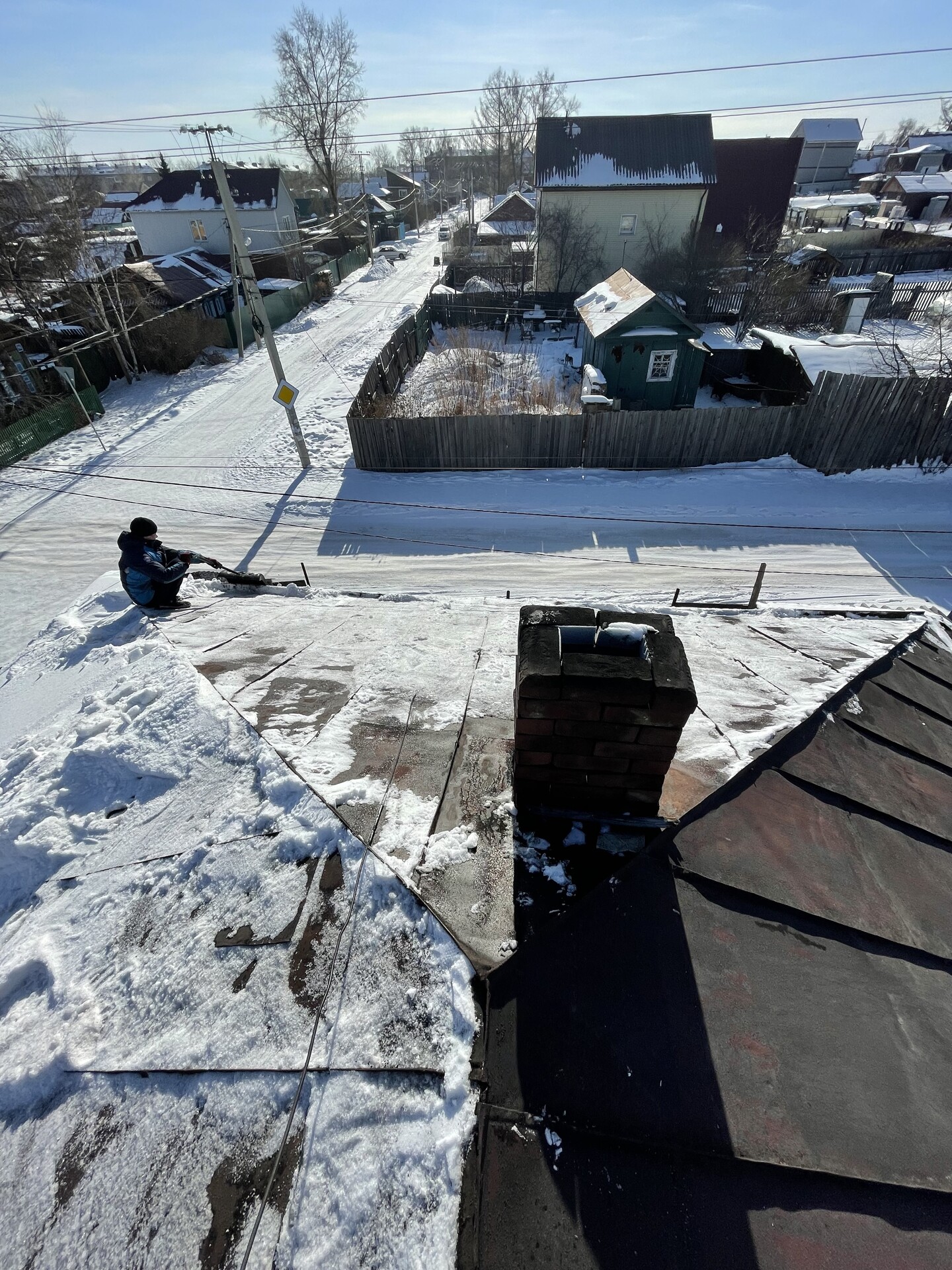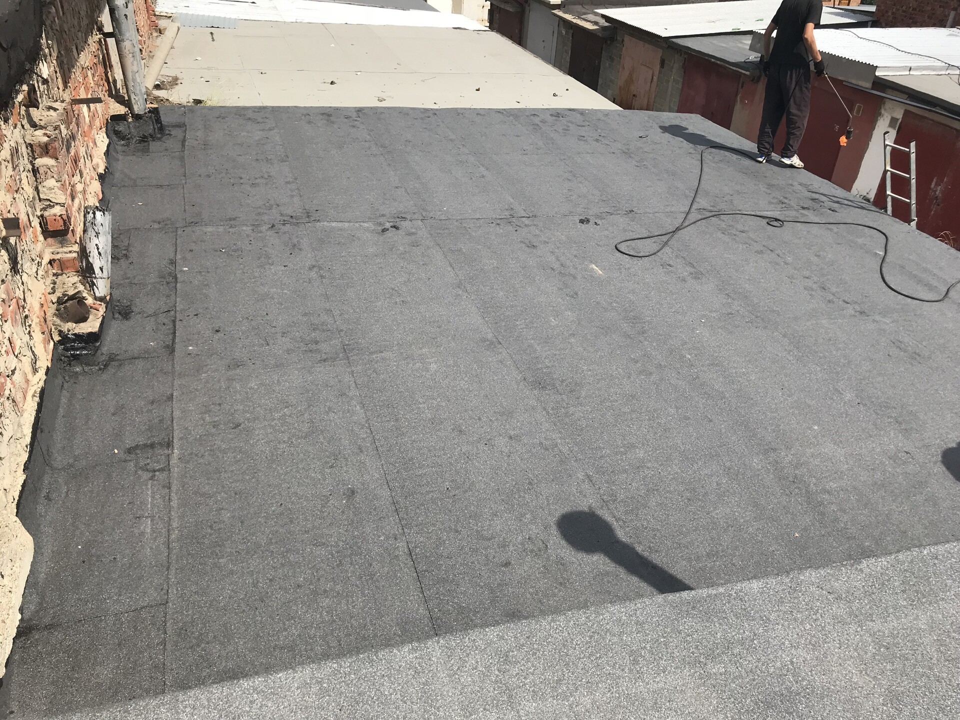 Очищаем поверхность крыши для качественного наплавления кровельного полотна, затем идет устройство наплавляемой рулонной кровли с помощью газовой горелки с соблюдением всех мер пожарной безопасности, при необходимости устанавливаем водосточный желоб.