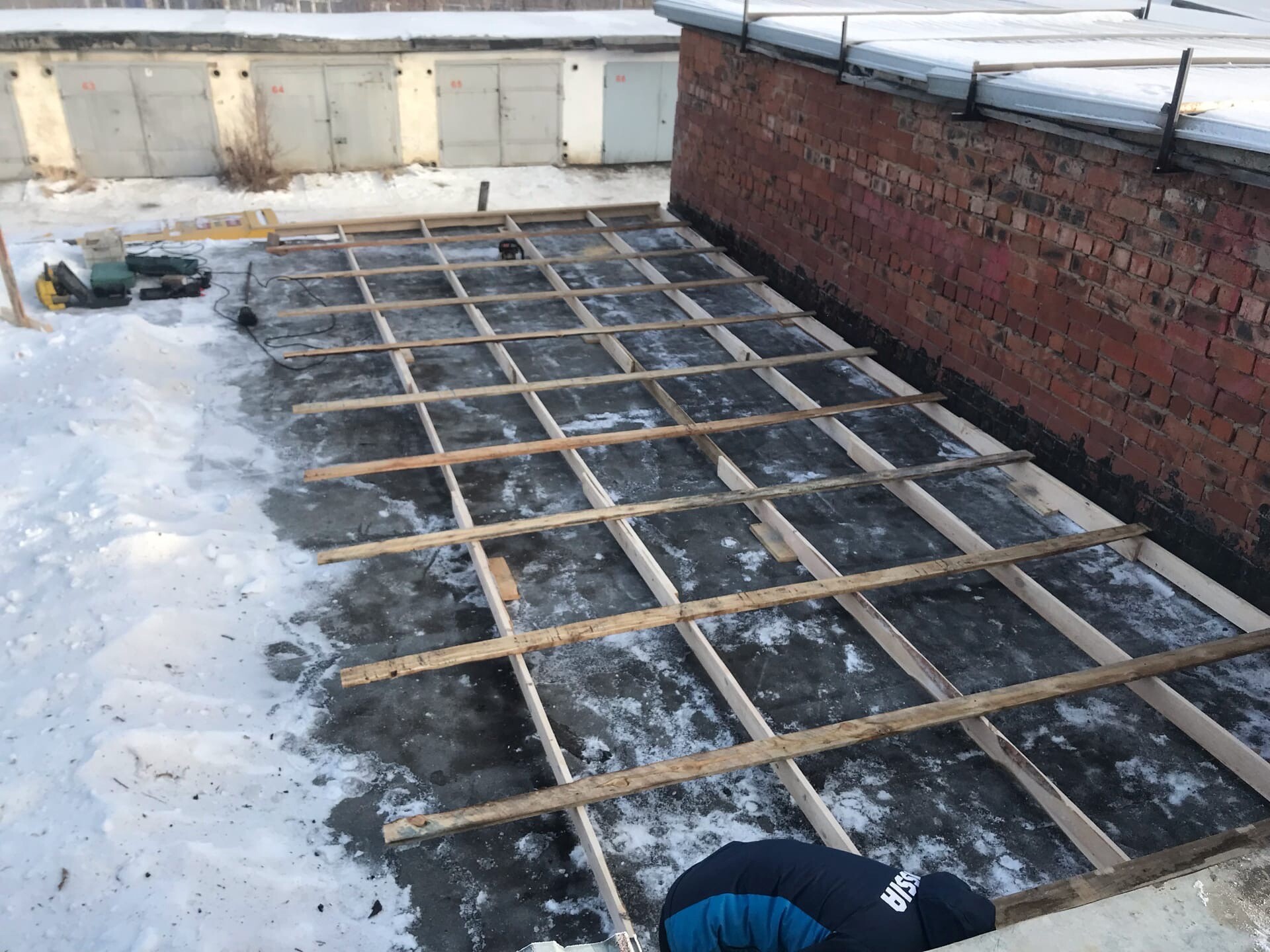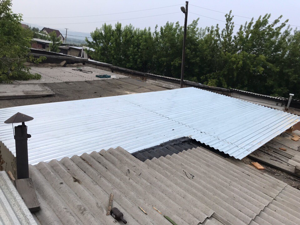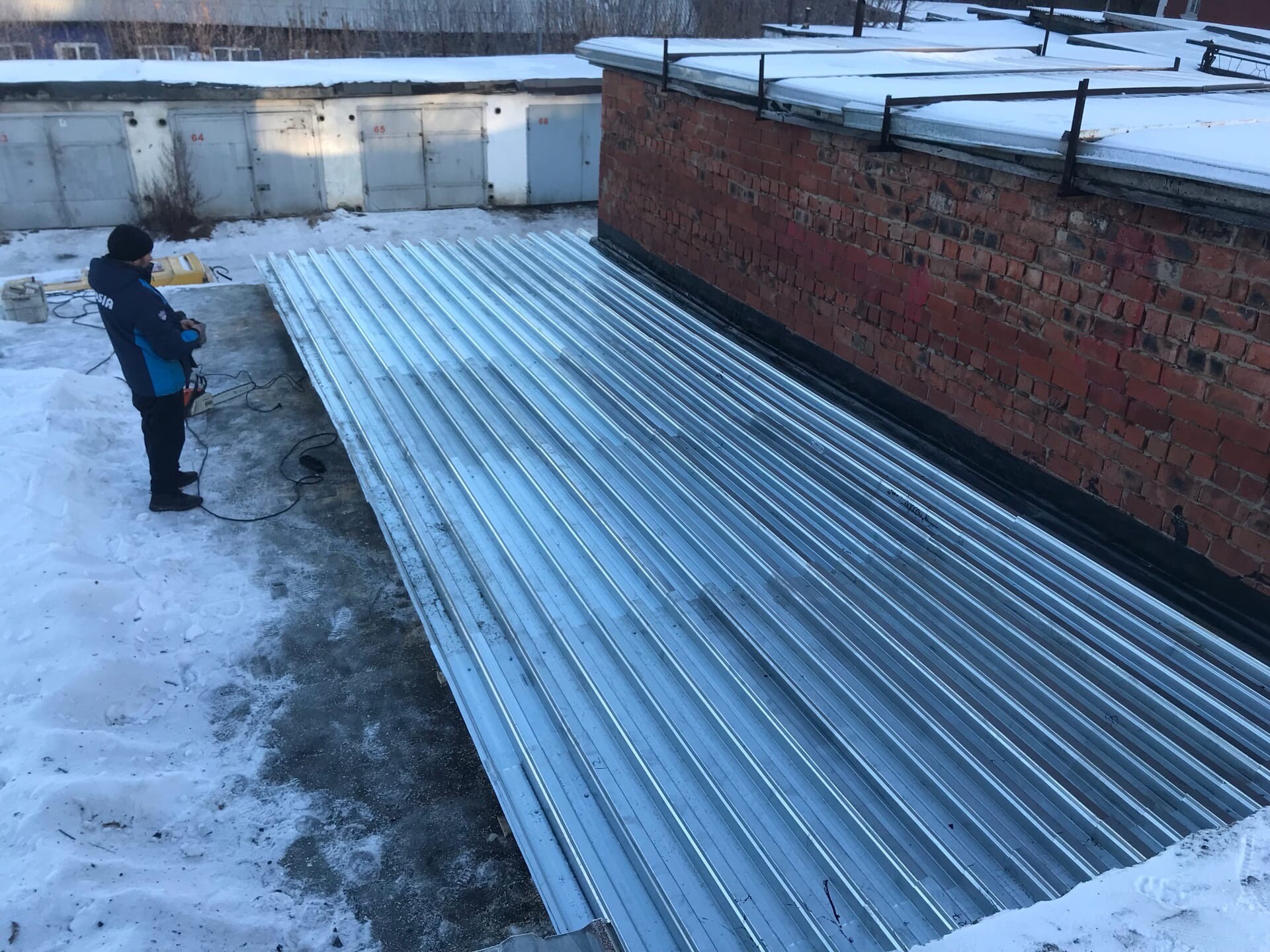 Мастер бесплатно выезжает на замер кровли, сразу называет стоимость работ, на следующий день кровельная бригада закупает все необходимые материалы и доставляет их на объект. Поверхность крыши очищается и подготавливается, укладывается стропильная система, крепится на рамные анкера к бетонному основанию, производится монтаж обрешетки и профнастила. При необходимости выполняется гидроизоляция примыканий от соседних гаражей для лучшей гидроизоляции. По желанию заказчика устанавливается козырёк либо водосточный желоб.